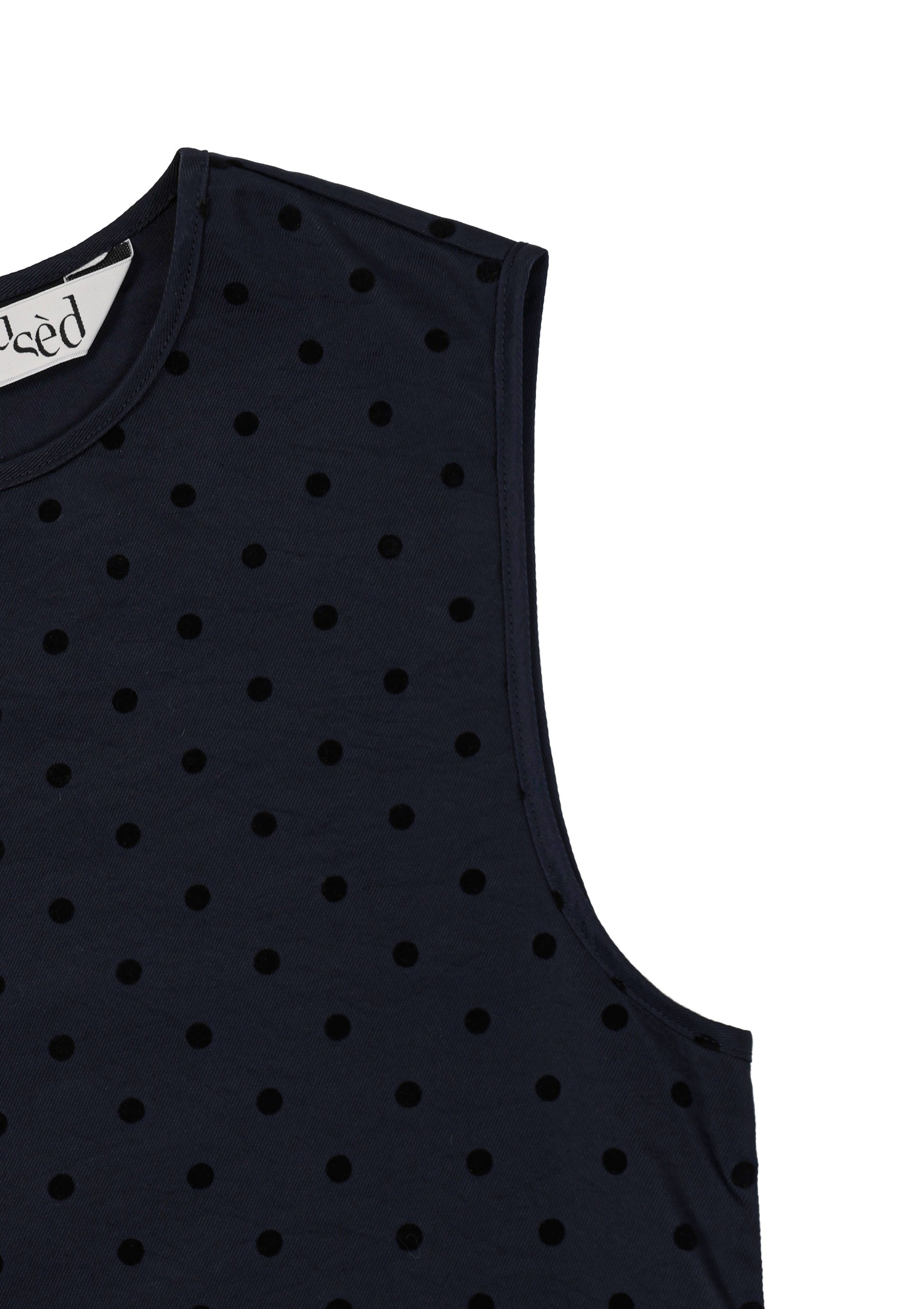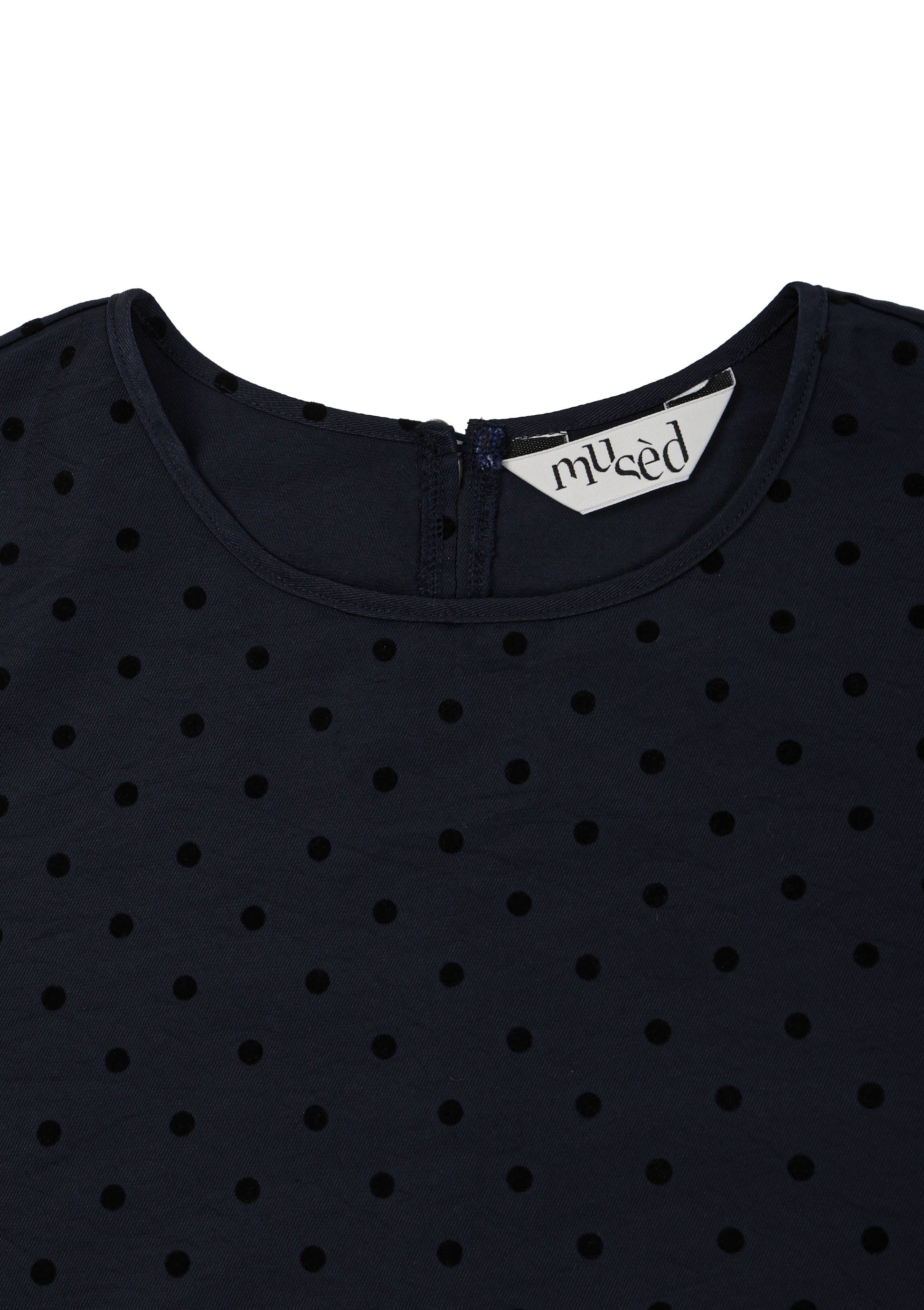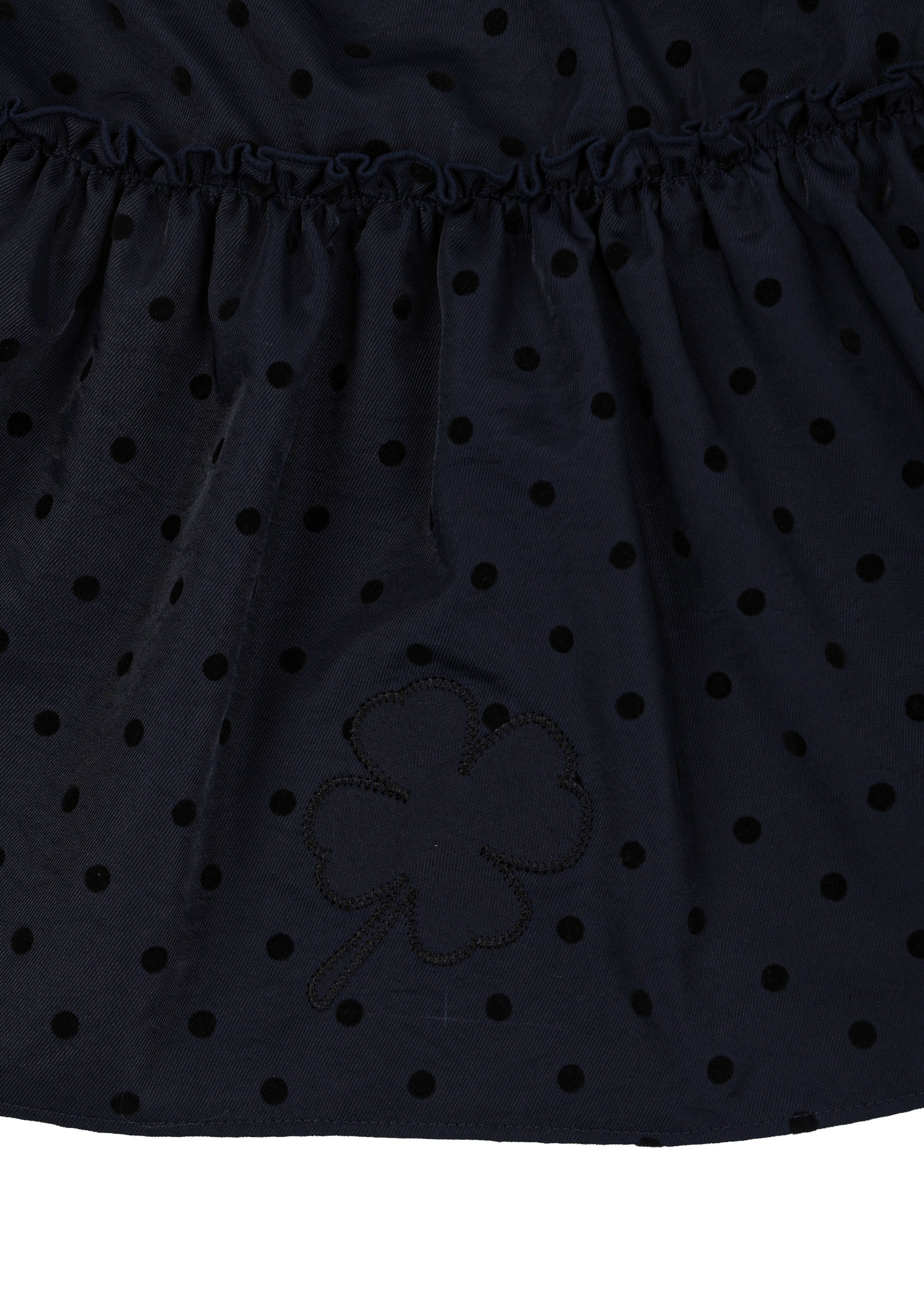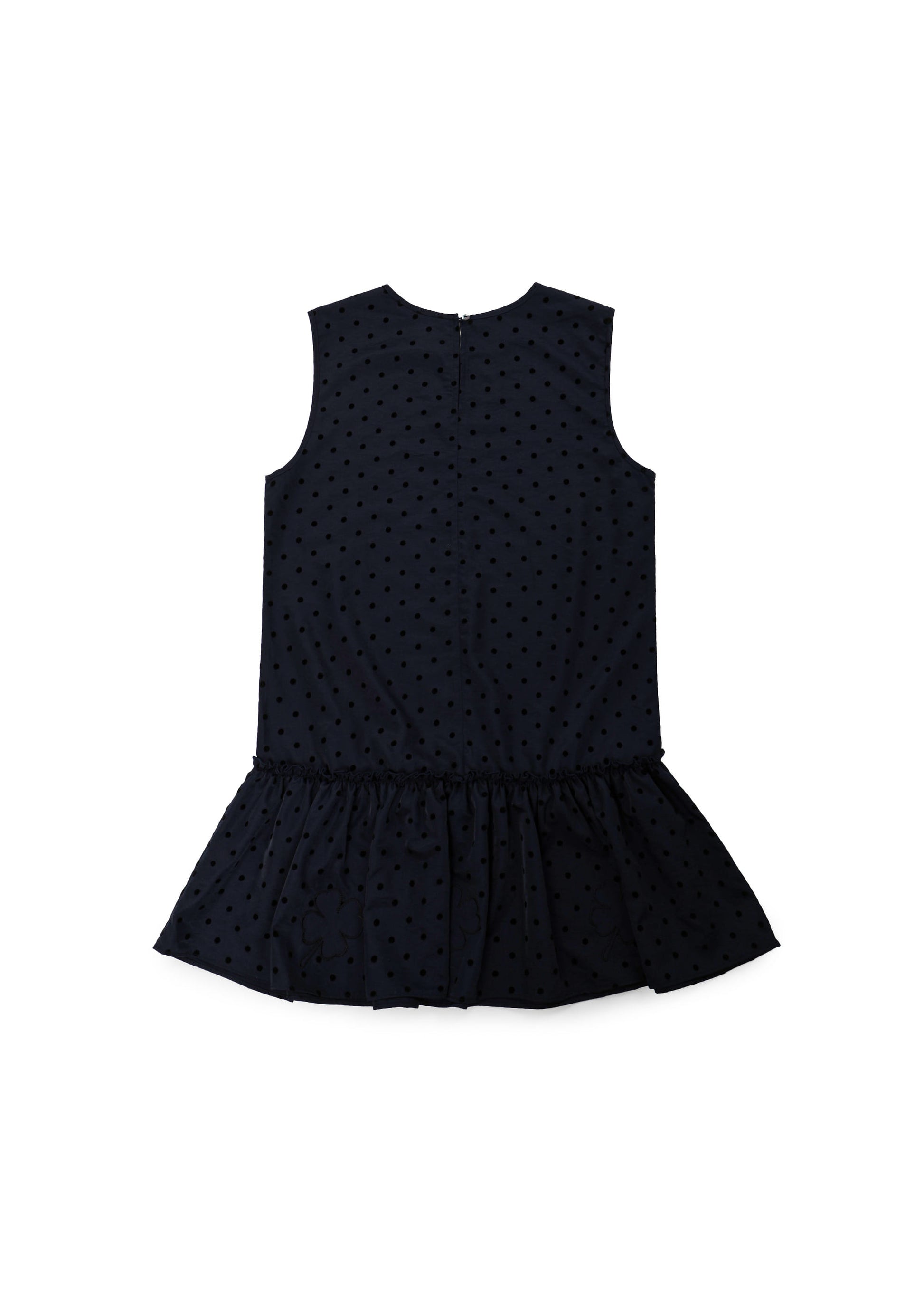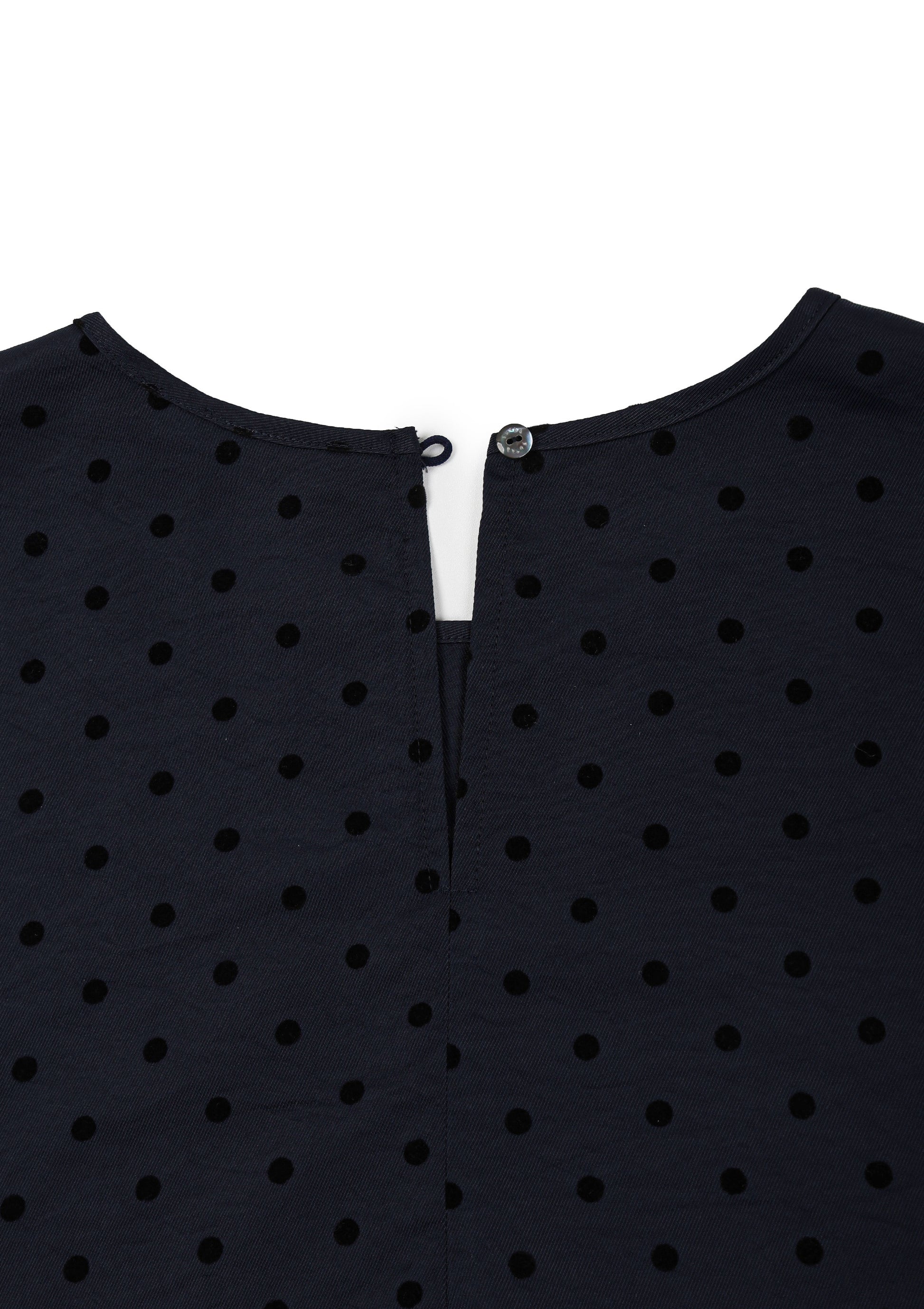 ネイビードットは生地にあしらわれたさりげないベルベットドット柄が、シンプルながらも愛らしい雰囲気を演出。