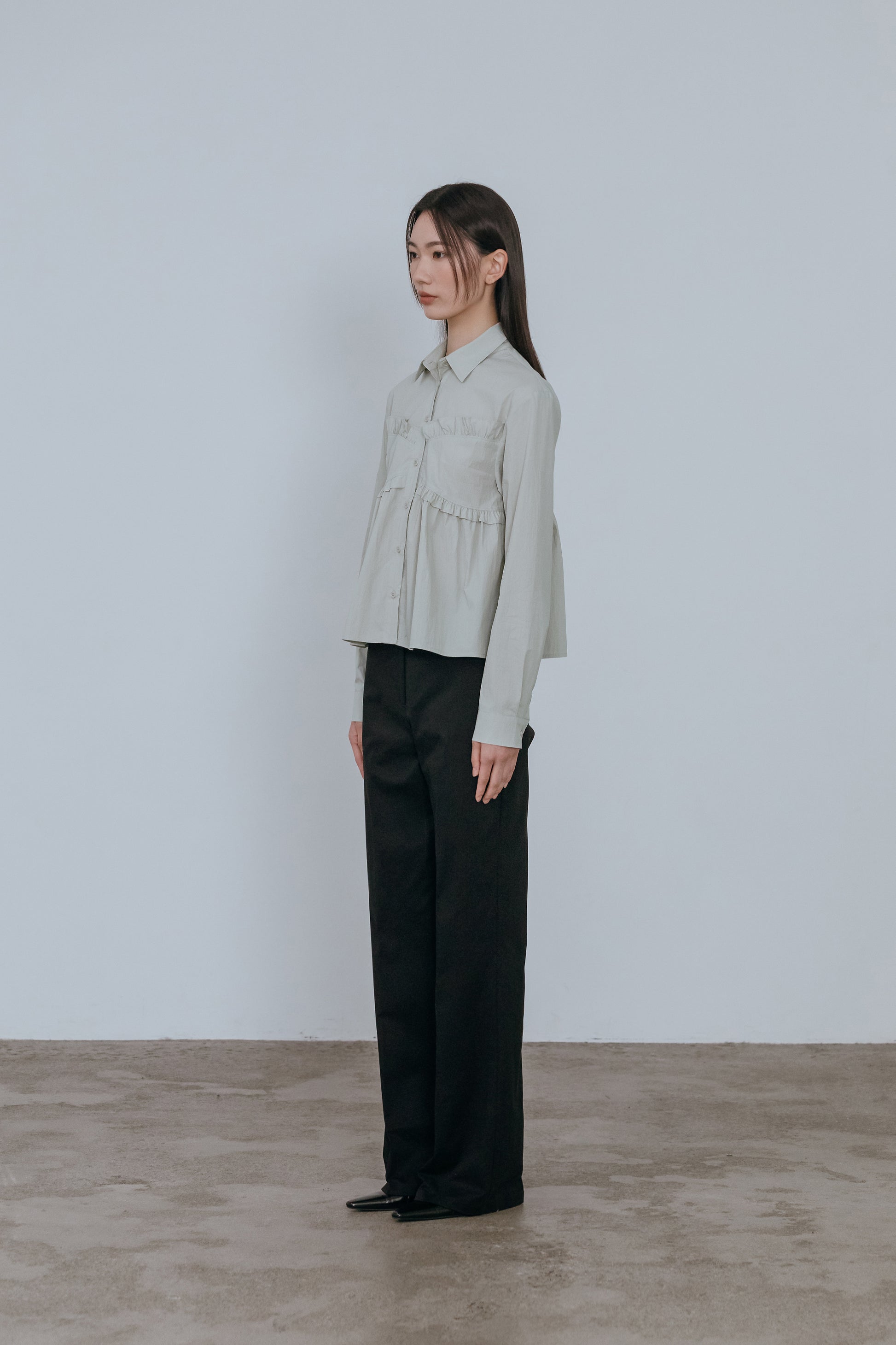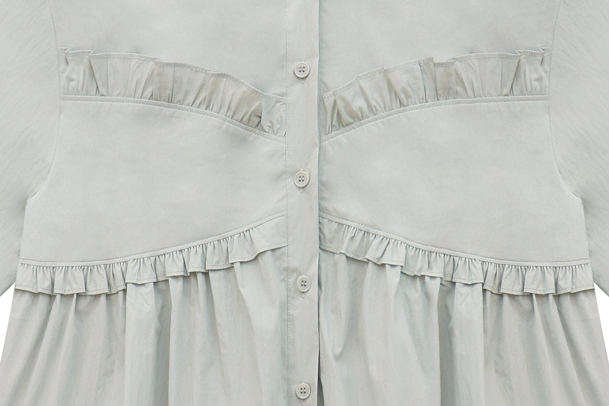 フリルとギャザーを寄せたデザインがフェミニンで可愛らしい印象の一着です。