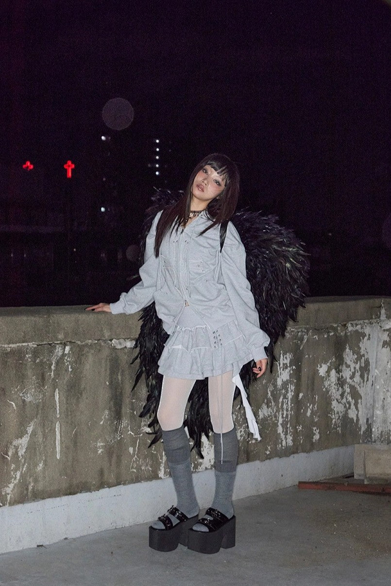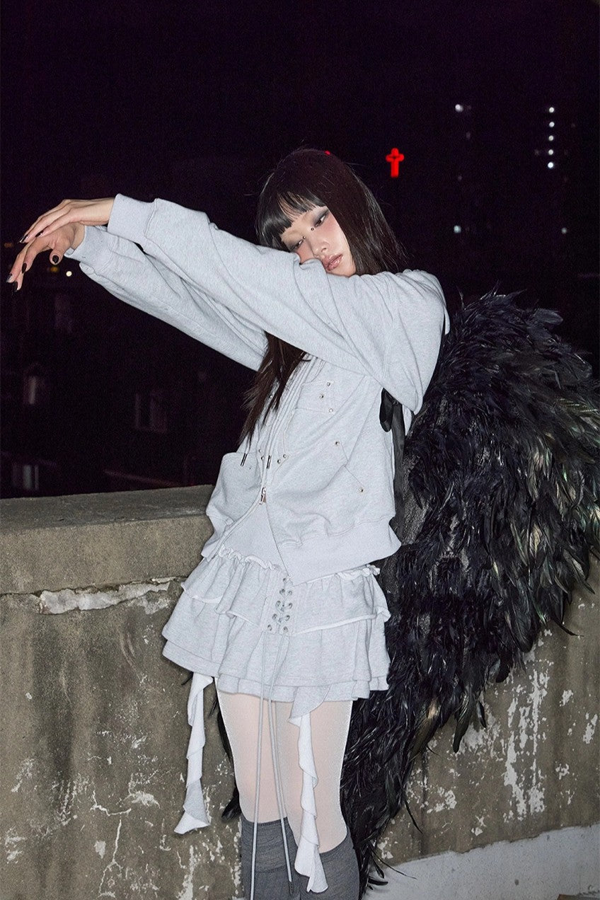 3段ティアードデザインに、レースアップとラッフルを効かせた特別な一枚。